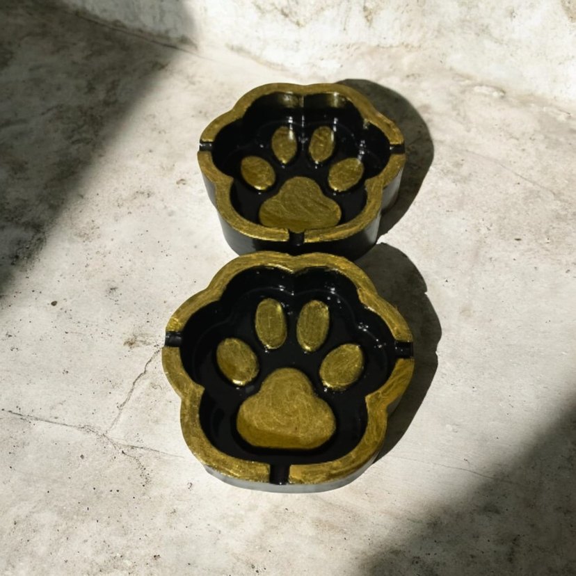 Köpek severler için tasarlanmış, patili şekilli altın renkli küllük. Koyu altın tonunda ve kompakt boyutta.