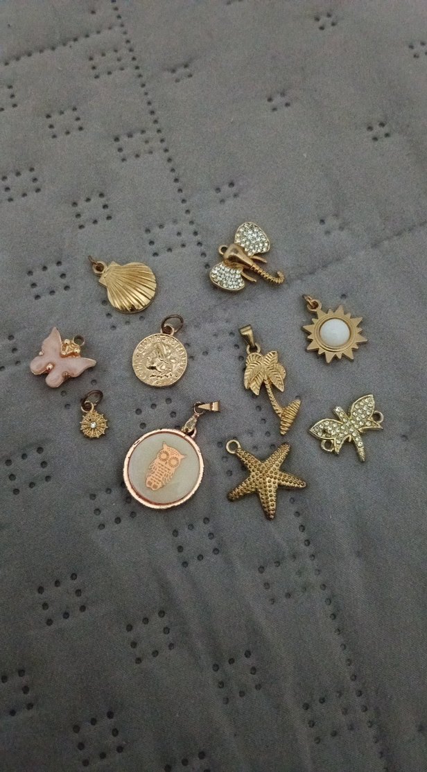 Payetli ve işlemeli desenlere sahip altın renkli bohem kadın charm seti, kelebek, yıldız ve güneş figürleri içerir. ✨ Set halinde 125 liradır.