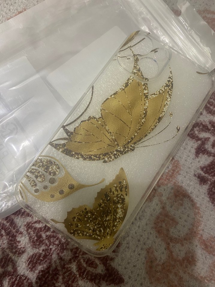 Altın renkli, payetli kelebek desenleriyle hafif bohem tarzda telefon kılıfı. Apple 14 için uyumlu