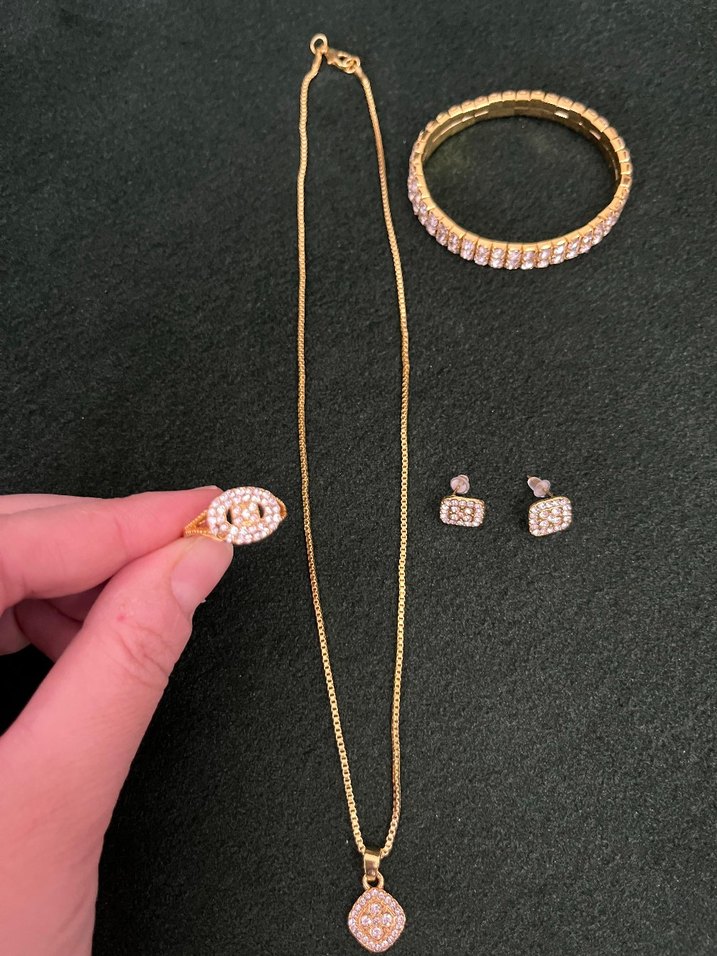 Payetli yüzük, kolye, bileklik ve küpelerden oluşan altın renkli takı seti. Günlük sokak stili için hafif ve desensiz tasarım. ✨