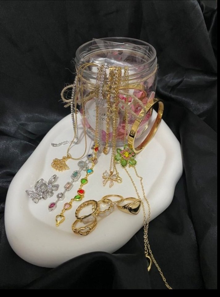 Bu kavanozumuzda 15 adet takı bulunmaktadır hepsi yeni ve etiketlidir. gold silver veya karışık olarak kişiye özel hazırlanmaktadır. hepsi yeni trend ürünlerdir. kaliteli takılar uygun fiyata keyifli alışverişler diliyorum✨️