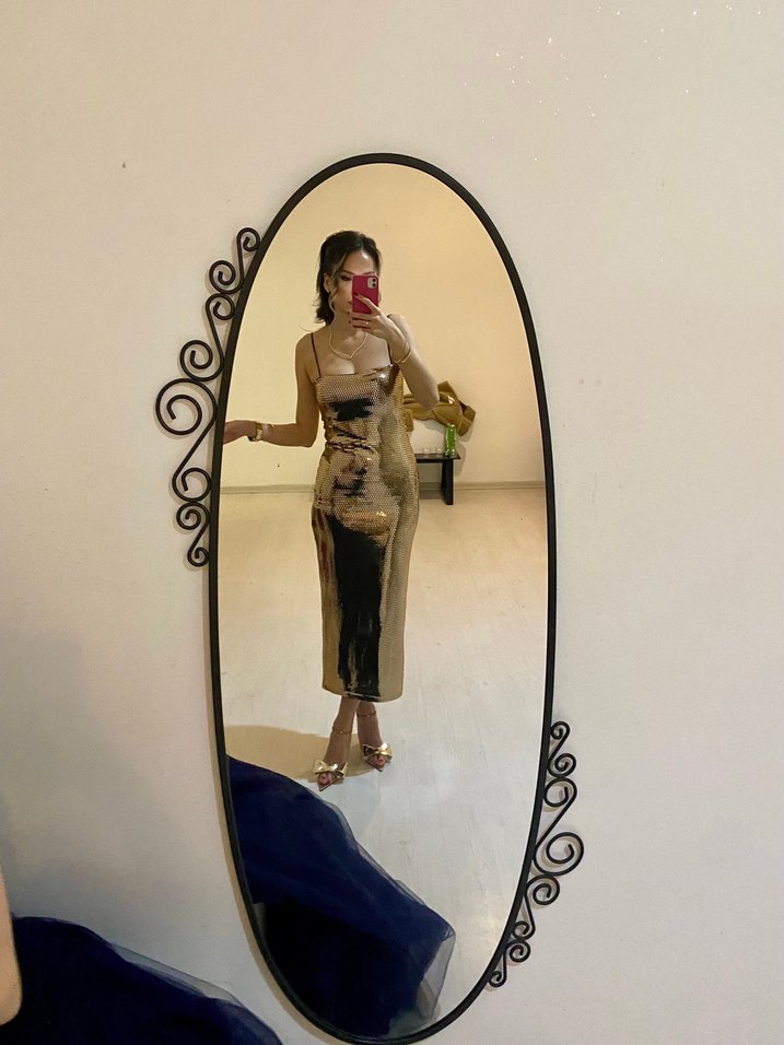 Gold renk, straplez ve vücuda oturan midi boy elbise, boyum 170 kilom 55 bir kez giydim m beden ama kalıbı dar