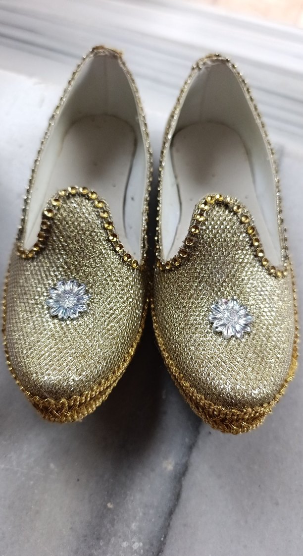Parlak altın renkli sentetik kumaştan yapılmış, işlemeli ve payetli özel ayakkabısı, klasik şıklık sunar. ✨