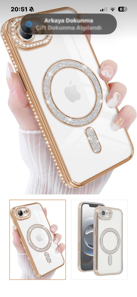 Altın renkli, payetli detaylara sahip modern klasik tarzda hafif ve şık telefon kılıfı. Ipone 16 s e uyumlu