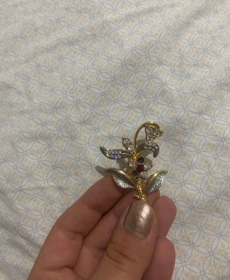 Parlak altın renkli, payetli ve çiçek desenli vintage bohem tarzda broş, düğünler için uygun.