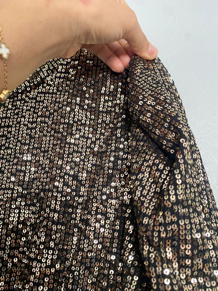 Uzun kollu, yuvarlak yakalı, payetli ve yılan desenli altın renkli midi boy dar kesim elbise, parti için uygundur. ✨ İlayda Özdemir tasarım abiye bide şal dahil