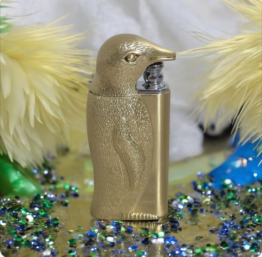 Parlak altın renkli ve penguen figürlü, detaylı tasarıma sahip kullanışlı çakmak.