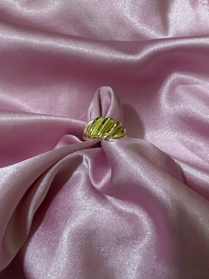 Altın renkli, pilili tasarıma sahip kadın yüzüğü. Klasik zarafetle bohem tarzını birleştirir. Düğünler için uygun.