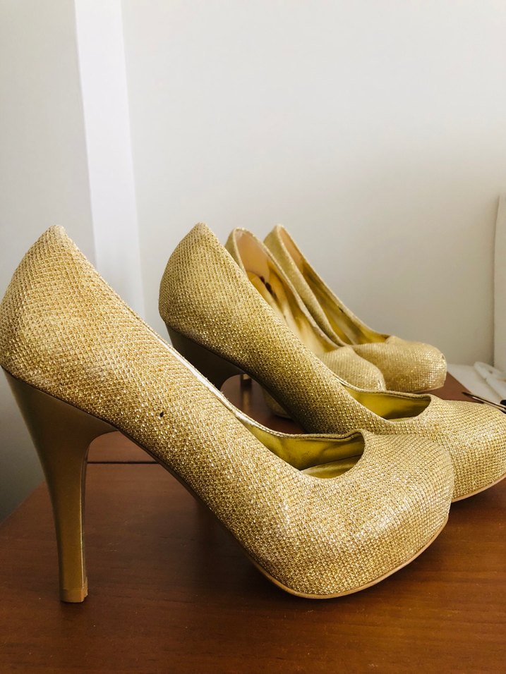 Parlak altın renkli simli üst yüzey, platform topuk kadın abiye ayakkabı. Düğün ve özel günler için uygun.37 numara mağaza ürünü