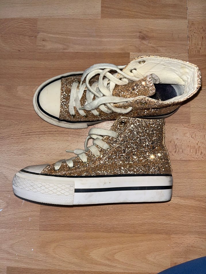 Altın ışıltılı platform tabanlı spor ayakkabılar, kauçuk tabanlıdır. Günlük sokak stiline uygun parlak ve yüksek bilek tasarımı. Fiyat icin tekliflere acigim.