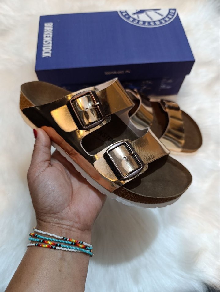 Altın parlak renkli, tokalı bantlara ve platform topuklara sahip Birkenstock kadın terliği. Günlük şıklık için desenli tasarım.