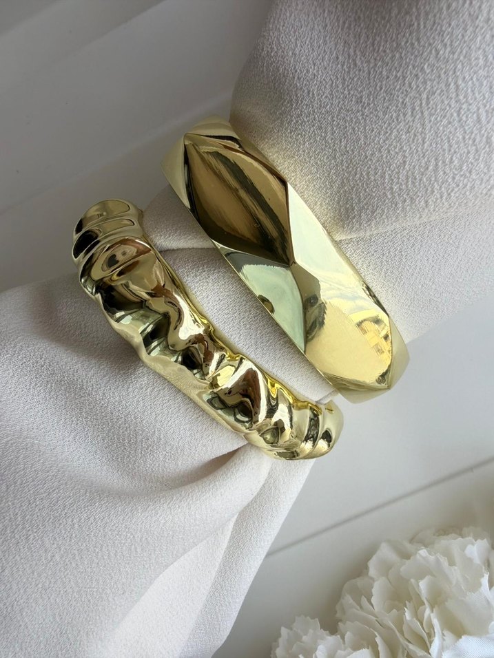 Parlak altın renkli, pliseli detaylara sahip çağdaş tarzda kadın bileklikleri, günlük kullanıma uygun ve göz alıcı. Bir adet ürünün fiyatıdır, hangisini istediğiniz için mesajlar kısmından iletiniz.