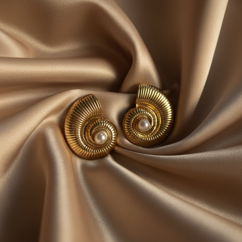 Altın renkli, pliseli ve inci detaylı midi küpe. Parlak yüzeye sahip, düğünler için modern klasik tarzda bir aksesuar.