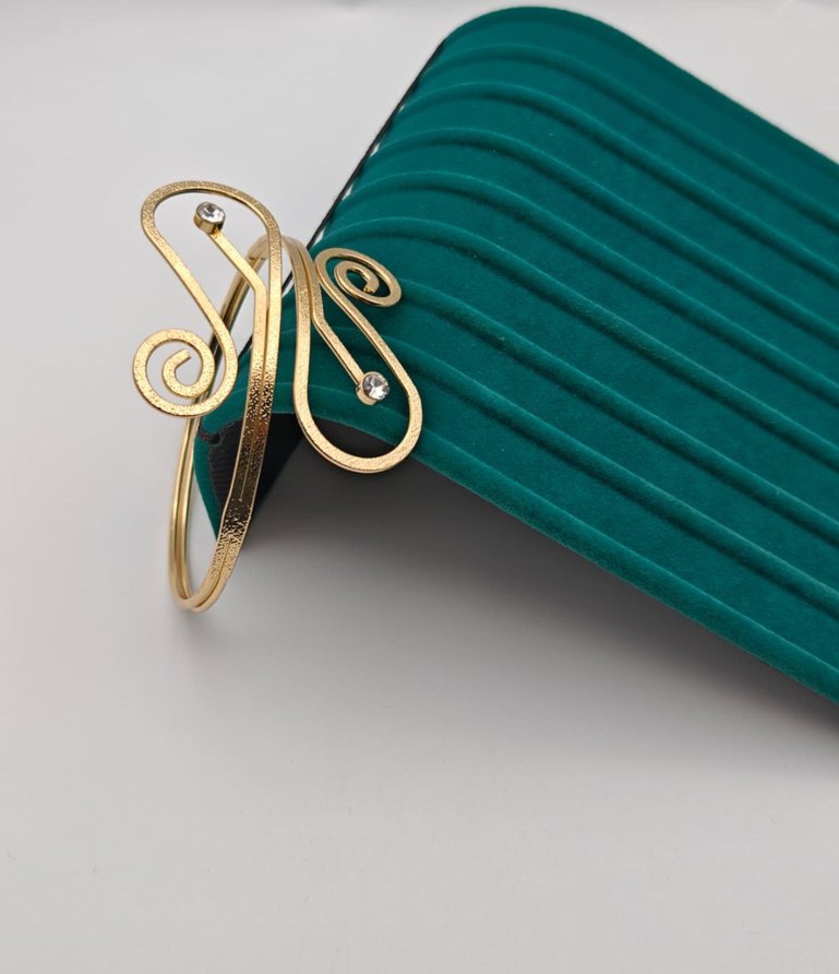 Altın renginde, pliseli kadın bileklik. İnce taş detaylarıyla düğünler ve günlük kullanım için uygun, çağdaş ve klasik şıklığı bir arada sunar.