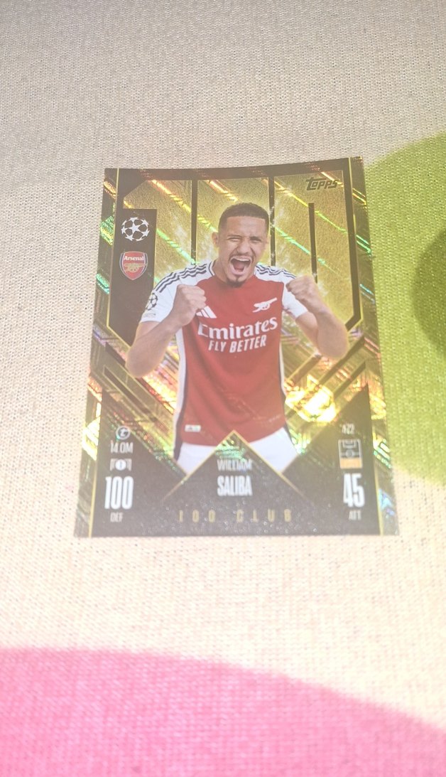 Parlak altın renkli, cesur athleisure tarzında pop kültür erkek rozeti. Üzerinde "Emirates, SALIBA, 00" yazısı bulunur. ⚽