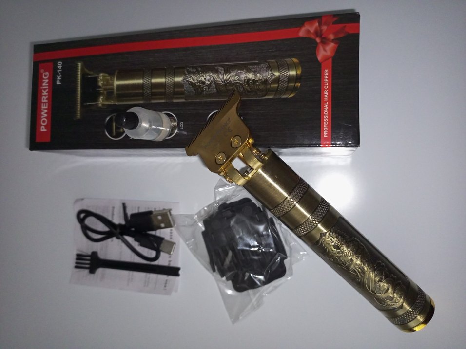 Altın renkli, detaylı işlemeli profesyonel saç kesme makinesi, USB şarj aleti ve tarak aksesuarları ile birlikte.