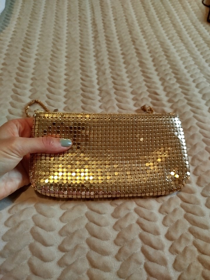Altın renkli, payet desenli kadın portföy çanta. Işıltılı tarz için uygun ✨ Çantanın bir tarafında aşağı kısımda siyah noktalar var 4.ve 5. fotoğrafta gözüküyor, kullanıma engel değil.