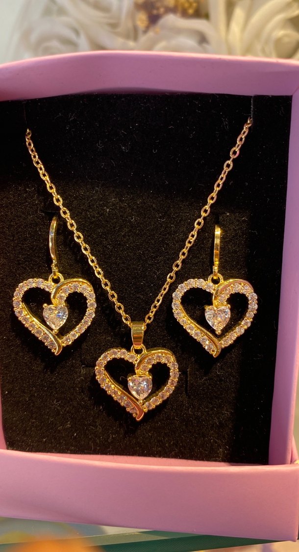 Altın renkli kısa kolye ve küpeler, pul işlemeli nakışlı kalp detaylarıyla cesur ve gösterişli bir tarz sunar.