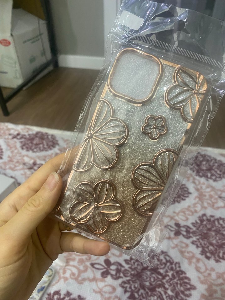 Altın renkli, pullu çiçek desenlerine sahip bohem tarzda hafif ve dekoratif telefon kılıfı. Apple 14 için uyumlu