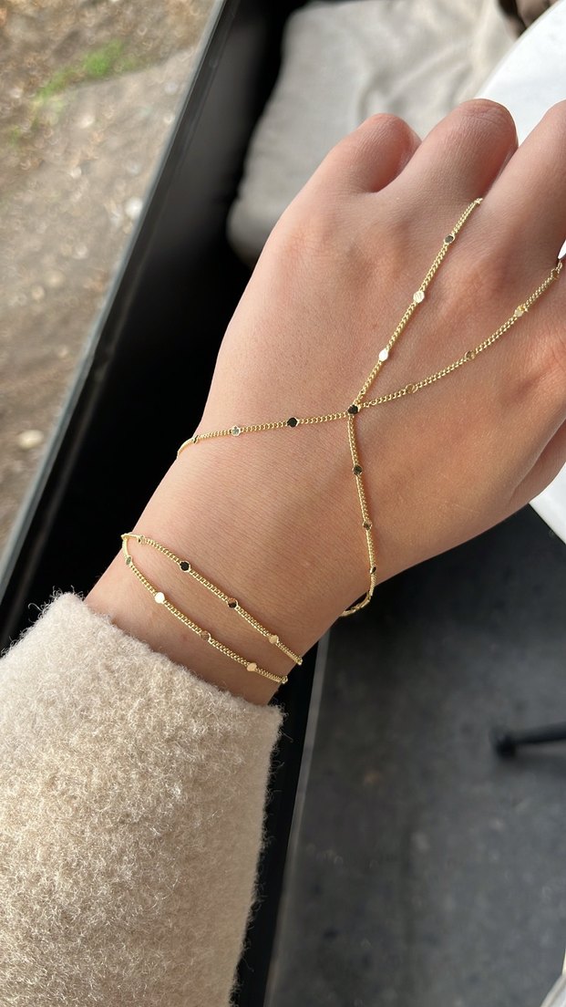Altın renginde, zincir detaylı ve parlak nokta desenli kadın el zinciri. Minimalist bohem tarzıyla günlük kullanıma uygun.