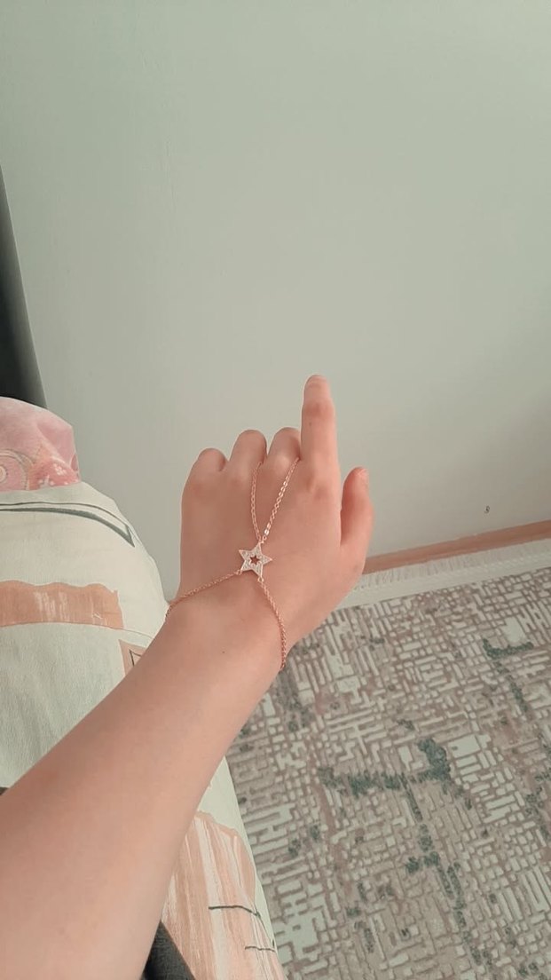 Pullu yıldız detaylı, altın renkli el zinciri. Minimalist ve bohem tarzda, günlük kullanıma uygun.