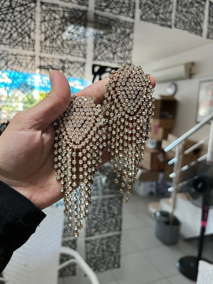 Altın renkli, pullu detaylara sahip bohem tarzda, yılan desenli ve midi uzunlukta küpeler. Düğün ve gösterişli etkinlikler için uygundur. ✨