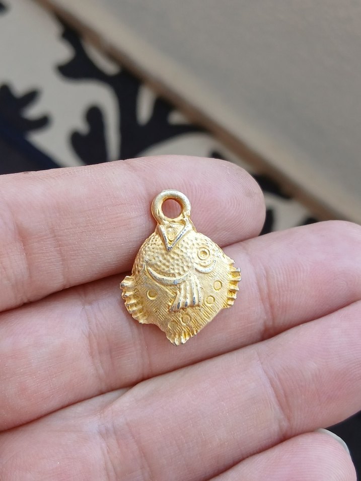 Altın renkli, bohem tarzda balık figürlü, püskül detaylı vintage ve retro esintili takı charmı. Düğünlerde kullanılabilir.