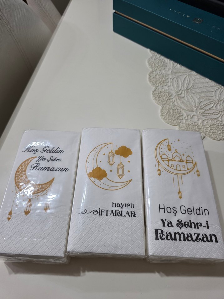 Altın renkli, Ramazan temalı baskılarla süslenmiş peçetr. Ay, fener ve hoş geldin mesajları içerir. ✨3 adet fiyatıdır