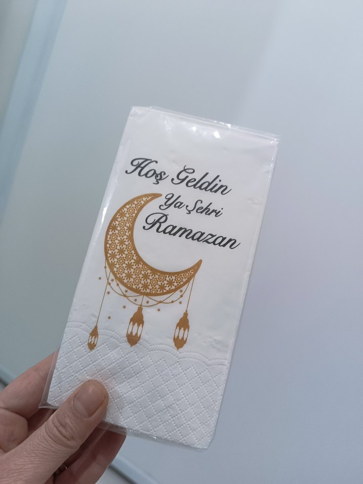 Altın renkli ay ve "Hoş Geldin Ya Şehri Ramazan" yazılı, bohem tarzda erkek mendili. Ramazan için uygun, sade ve şık bir tasarım.