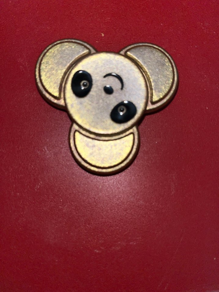 Siyah düğme gözlü, basit ve sevimli ifadeye sahip altın tonlarında renkli fare figürü.