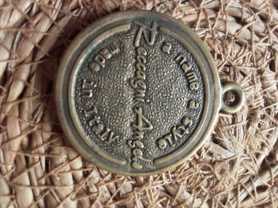 Altın renkli, parlak ve retro tarzda erkek rozeti. Üzerinde "CeccagniA" yazısı ve vintage işlemeler bulunur. Bohem tarz için uygun. ✨