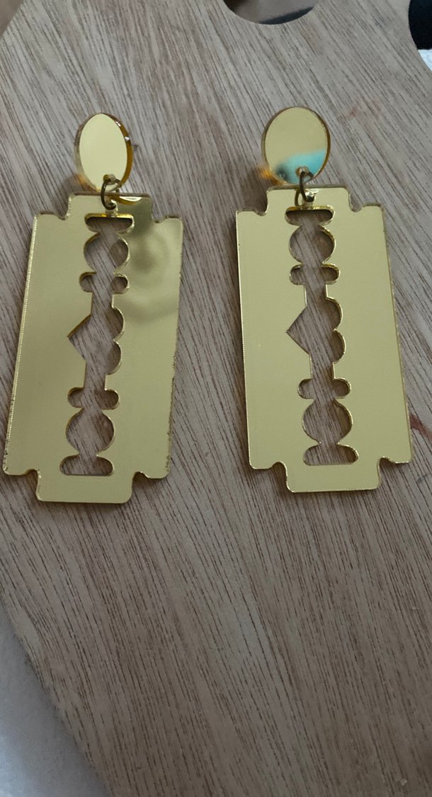Parlak altın renkli, tokalı ve retro ustura şeklinde kadın küpeleri. Bohem tarzda romantik akşamlar için uygun.