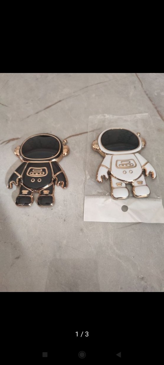 Altın renkli, koyu ve beyaz detaylı astronot şeklinde erkek küpeleri, rock punk ve avant-garde tarzını yansıtıyor.