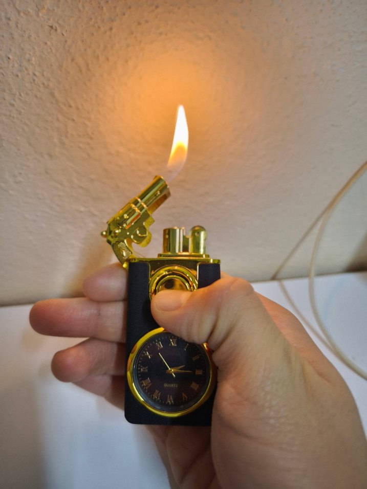 Altın renkli, içinde saat bulunan ve tabanca şeklinde alev çıkaran erkek çakmak. Parisli bisikletçi tarzını yansıtan renkli ve dikkat çekici tasarım.