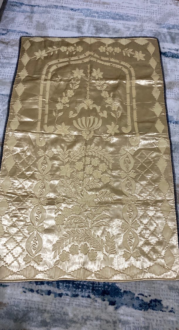 Geleneksel işlemeli, altın renkli, çiçek ve geometrik desenli, parlak ve pürüzsüz kumaştan çeyizlik seccade