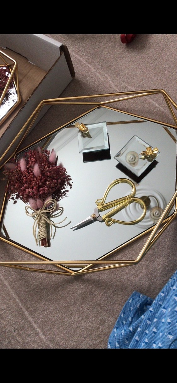 Altın renginde sekizgen çerçeveli dekoratif ayna, ev dekorasyonuna şıklık katar. ✨ Söz ve nişan tepsisi olarak kullanıldı bir defa.