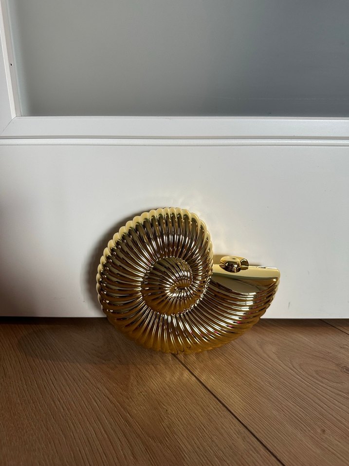 Parlak altın renkli seramik clutch çanta, tokalı kapama ve yılan derisi desenine sahip. Ofis için uygun, çağdaş tarzda klasik bir parça.
