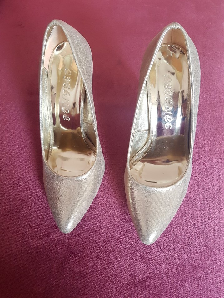 Kadınlar için altın renkli, simli yılan desenli stiletto topuklu klasik ve modern tarzda, ipeksi dokulu abiye ayakkabılar.