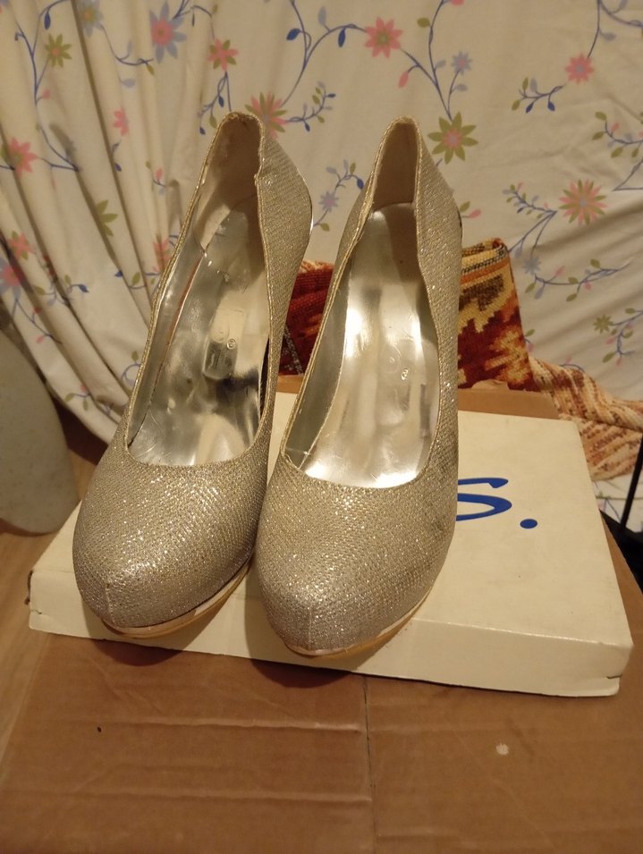 Altın renkli, simli yüzeye ve desenli yapıya sahip, kauçuk malzemeden yapılmış yüksek topuklu abiye ayakkabılar. ✨
