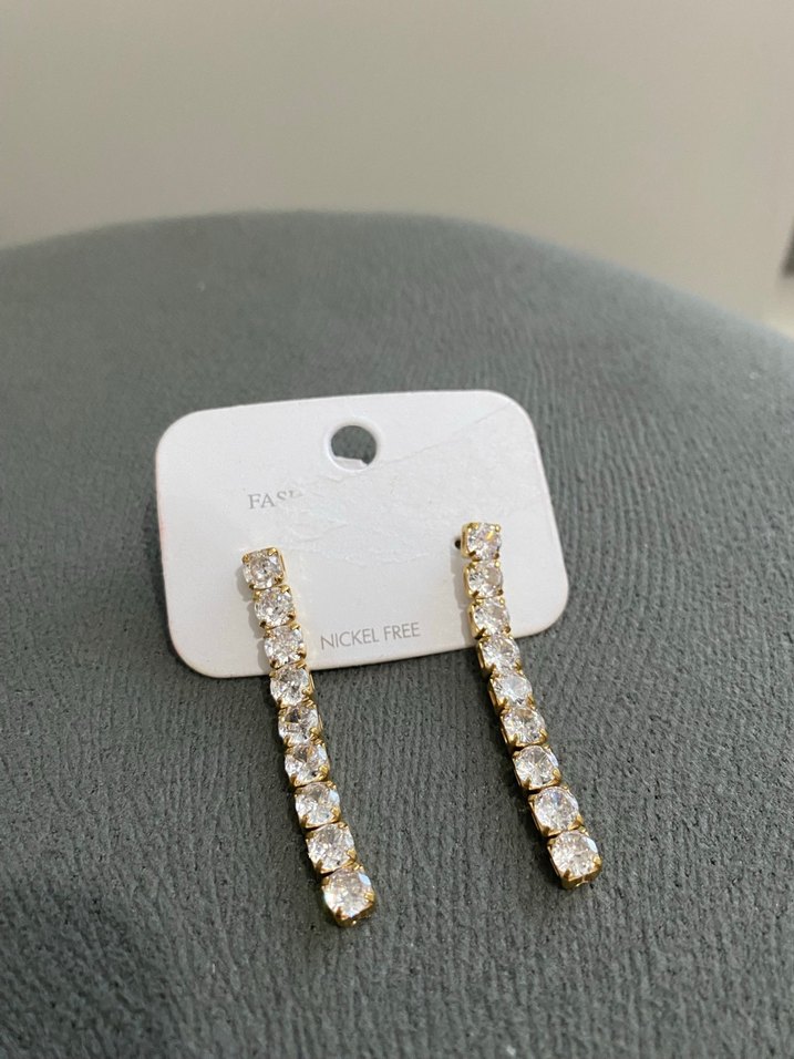 Altın renkli, sıralı taşlarla süslenmiş midi uzunlukta, minimalist yılan deseni detaylı küpe. Nikel içermeyen malzeme ile hassas ciltler için uygun. ✨