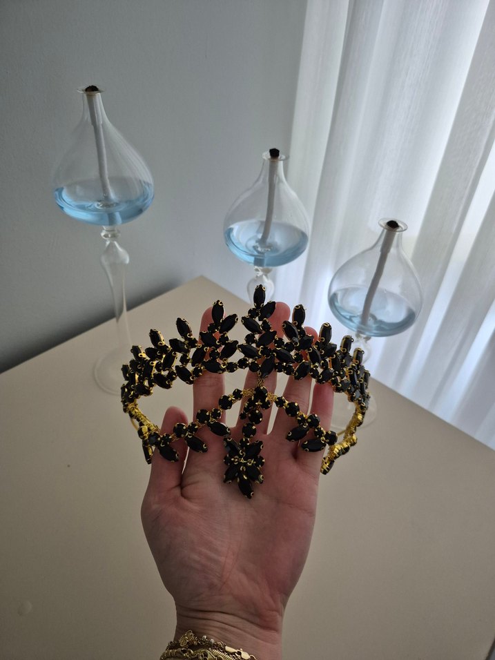 Altın renginde, siyah boncuklarla süslenmiş kına tacı. siyah kaftan ile giyildi hoş bir görüntüsü var.
