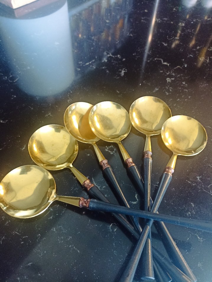 Parlak altın renkli kaşık başları ve siyah saplardan oluşan altı adet tatlı kaşığı seti. ️