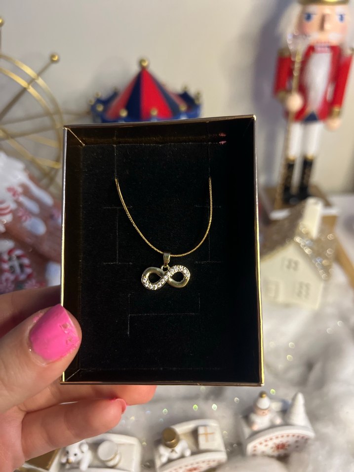 Parlak desenli sonsuzluk figürlü, zincir detaylı kısa altın renkli kolye, modern ve trend görünüme uygundur.