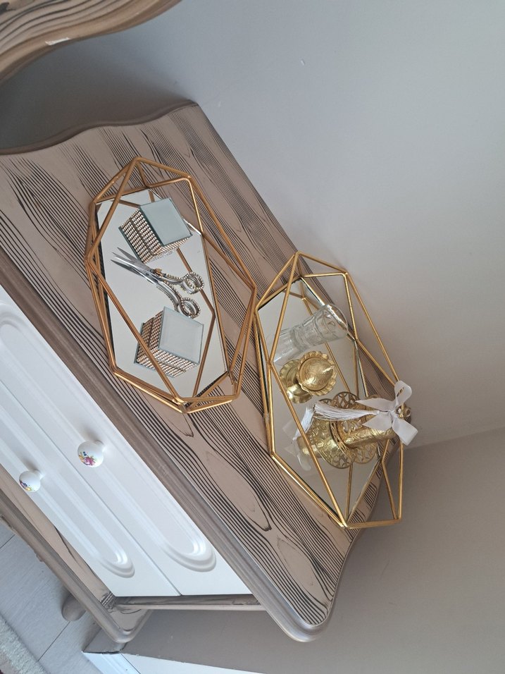 Altın renkli, geometrik metal çerçeveli ve aynalı tabanlı makyaj organizeri, şık ve kullanışlıdır. ✨