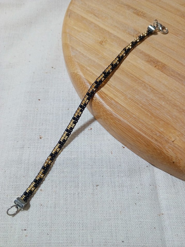 Boncuklu bileklik, koyu altın renkli T deseniyle minimalist ve karşı kültür tarzını birleştirir. Günlük kullanım için uygundur.