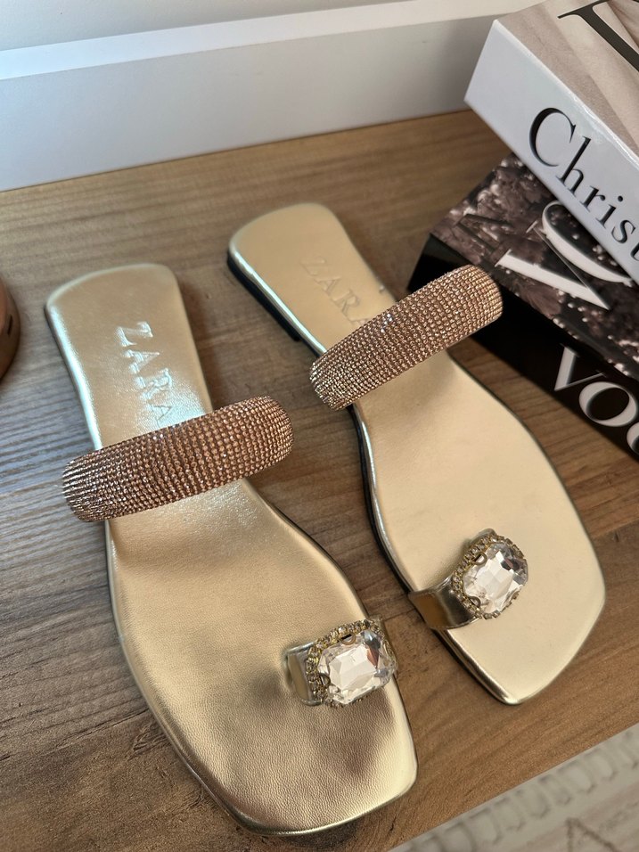 Altın renkli, taşlı bantlara sahip kadın terlikleri stiletto topuklu ve parlak kauçuk malzemeden üretilmiştir. Yılan derisi desenli, çağdaş ve klasik şıklığı bir araya getirir. Günlük kullanıma uygundur.