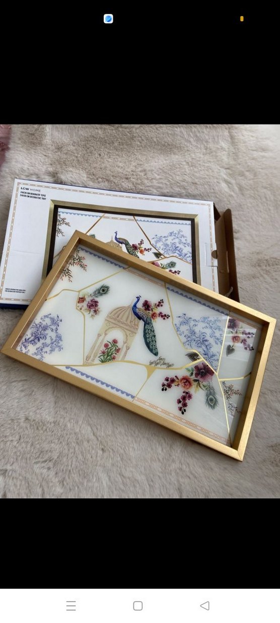 Altın renkli çerçeveye sahip bu tepsi, tavuskuşu ve çiçek desenleriyle şıklık katar.