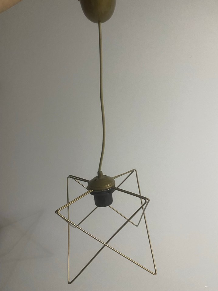 Altın renkli tel detaylı sarkıt lamba, modern ve hafif bir görünüm sunar. Tek kablo ve sade tavan aparatı ile asılır. Sorunsuzdur bana 1 fazla geldiği için satıyorum