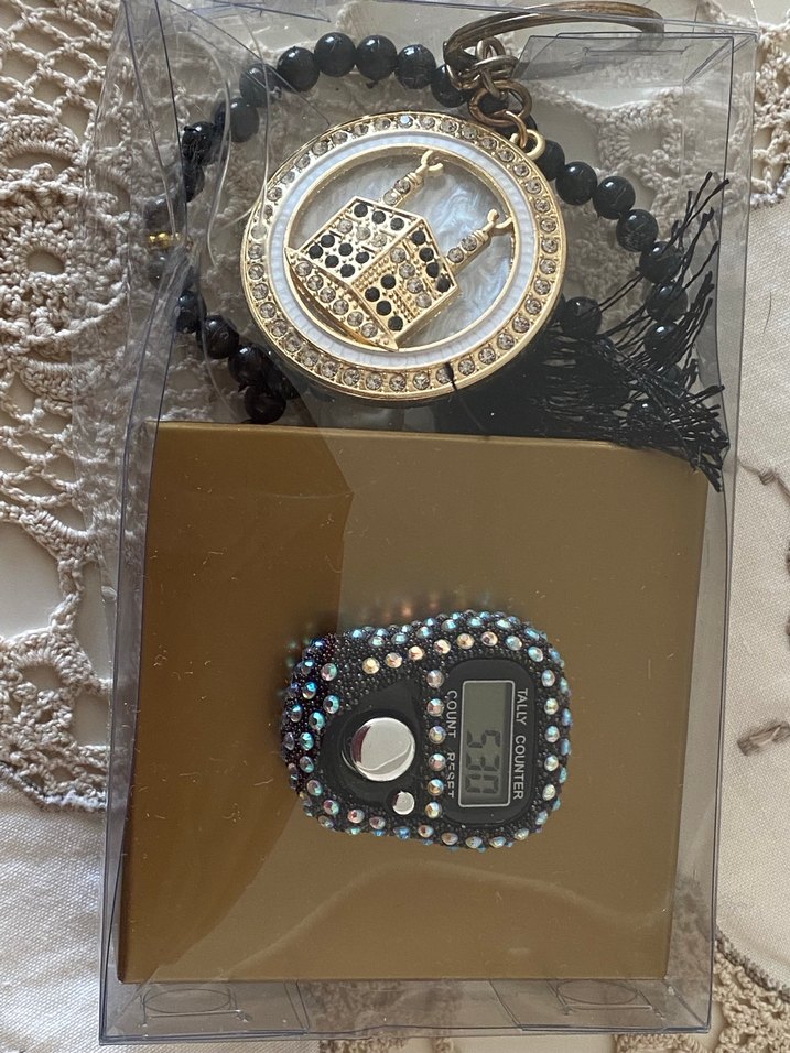 Sifir urunler …anahtaligin sap kismi fotodaki gibidir …Koyu renkli erkek tesbih, altın renginde dini figürlü süslemeye sahip ve dua sayısını takip etmek için taşlı dijital sayıcı ile birlikte.