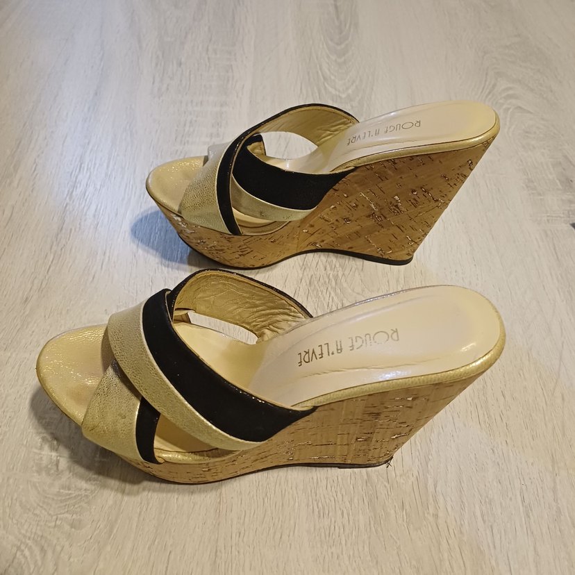 Parlak altın renkli, baskılı kauçuk tabanlı dolgu topuklu, tokalı bantlarıyla cesur ve çağdaş Paris tarzını yansıtan kadın terlik.